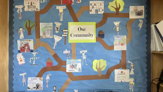 Students first created different places in our community, then after we learned about how people use their time, talent, and treasure, students added different community helpers to the board.