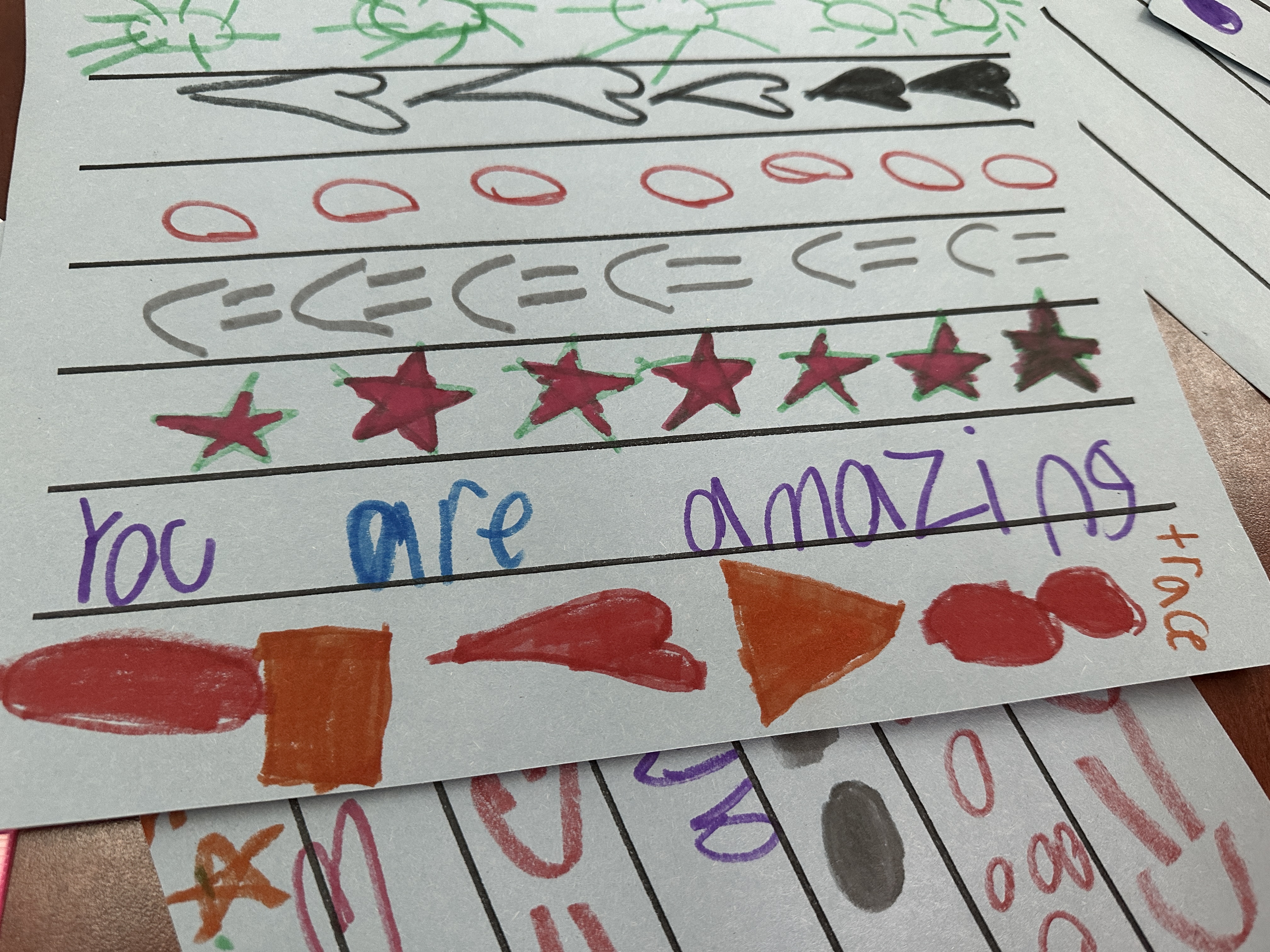 While completing the Navigating School Unit, we used shape blocks to create a map of our school. After creating this hands-on visual, we created picture versions with a few more details than the blocks allowed. Each group of students was in charge of creating a map of each of the main rooms of the school we use (classroom, office, lunchroom, library, gym, music, playground), then we all drew ourselves on one piece of paper labeled "US". We posted these up connecting each picture as well as to a (real) picture of our school building. The students enjoyed creating both versions of our school map and took great pride in having the web on display all unit.