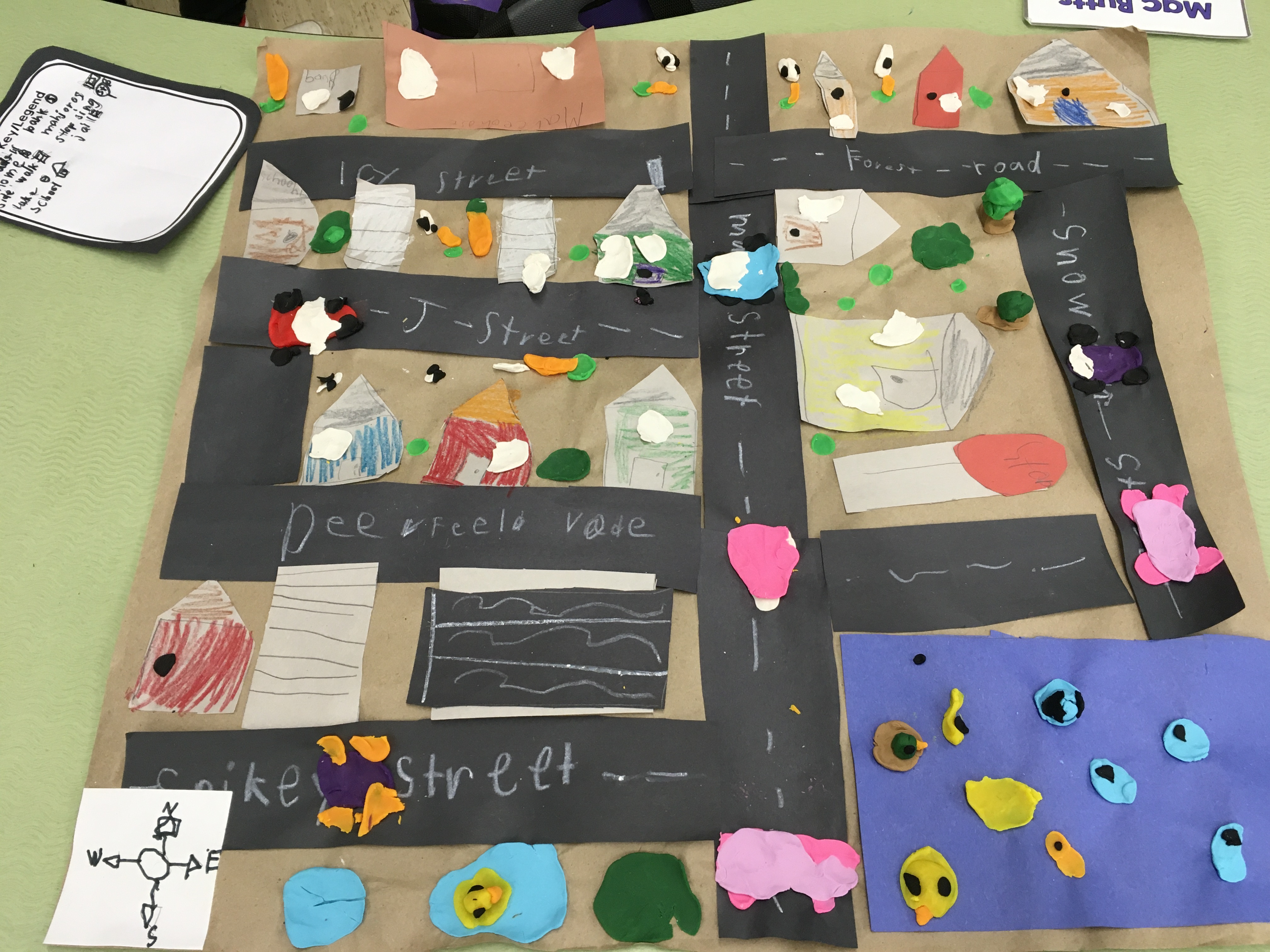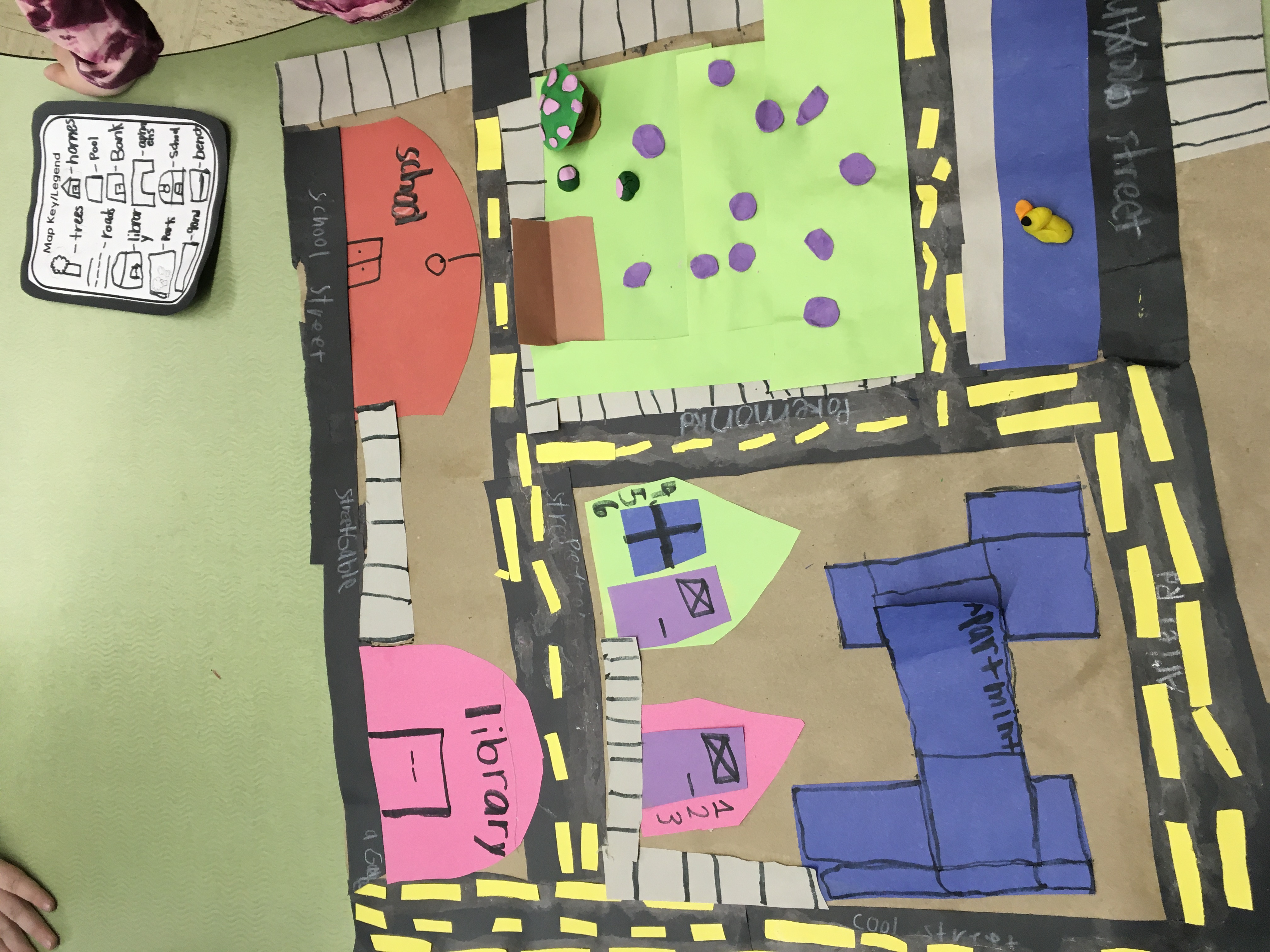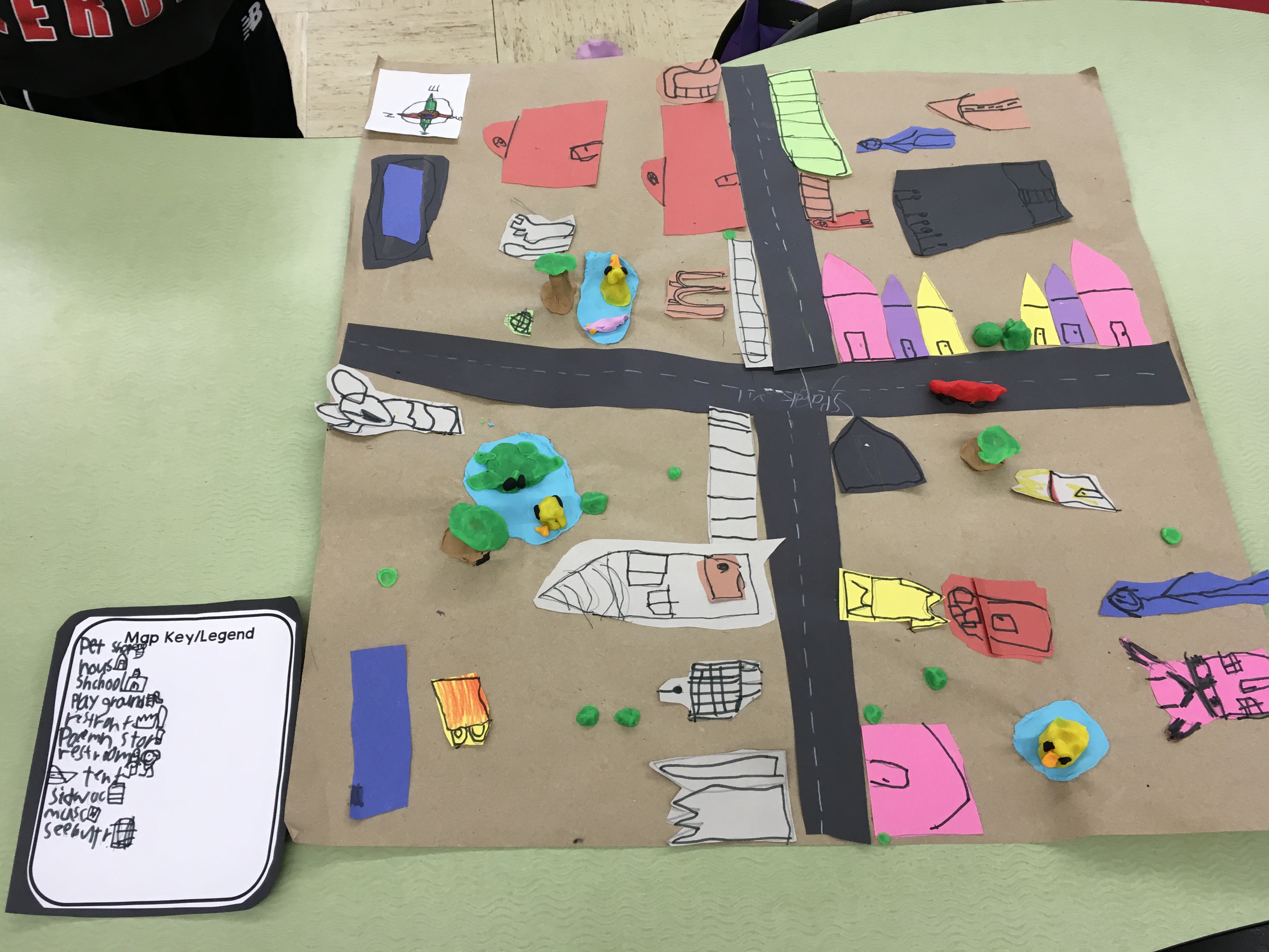 In a group, students created maps with a key and legend. Some groups tried to represent their hometown; others created a fictional village. Some teachers had students create a map as a cumulative project and included landforms as a feature within the map.
