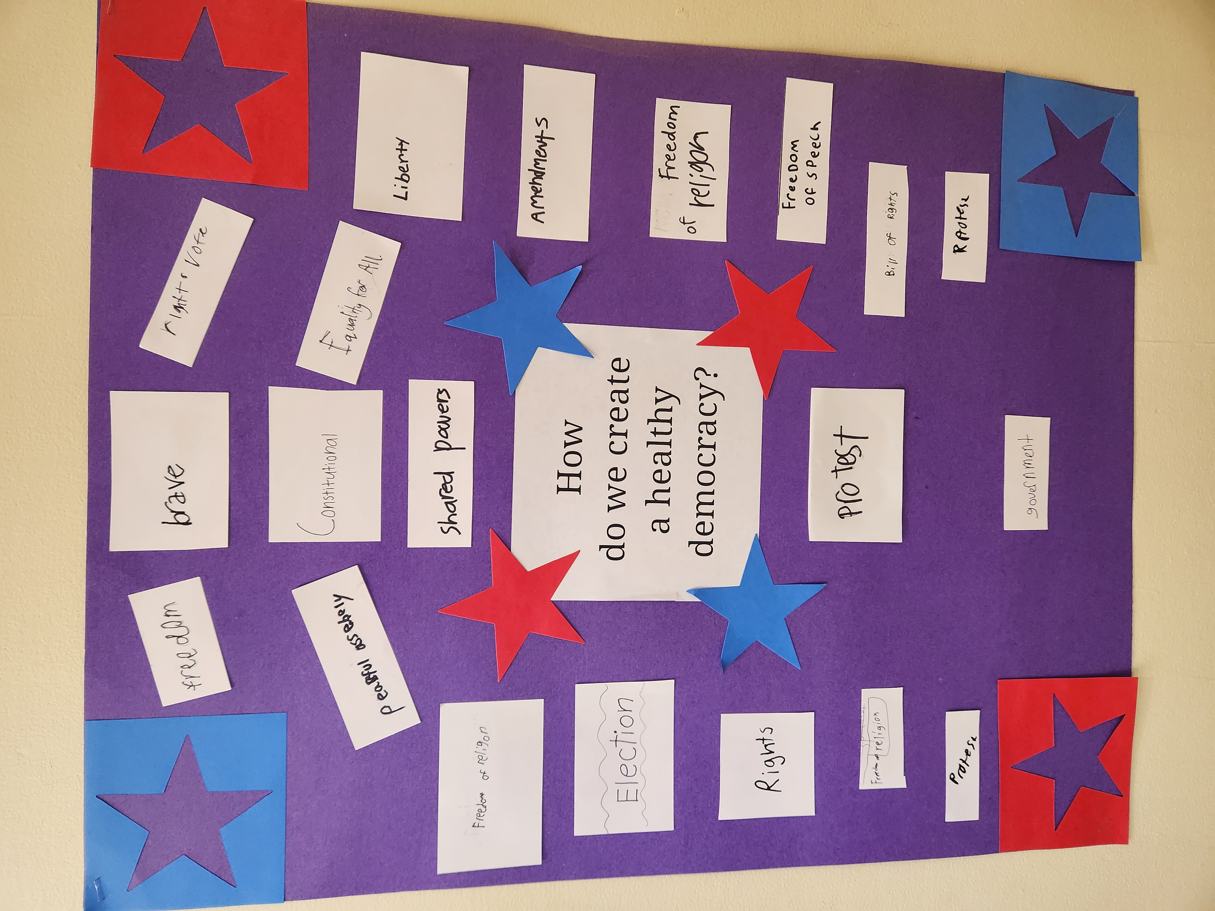 Students write one word/short phrases on index cards that describe what contributes to a healthy democracy and add to poster throughout unit.