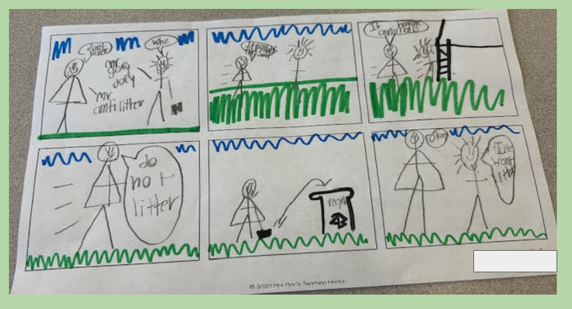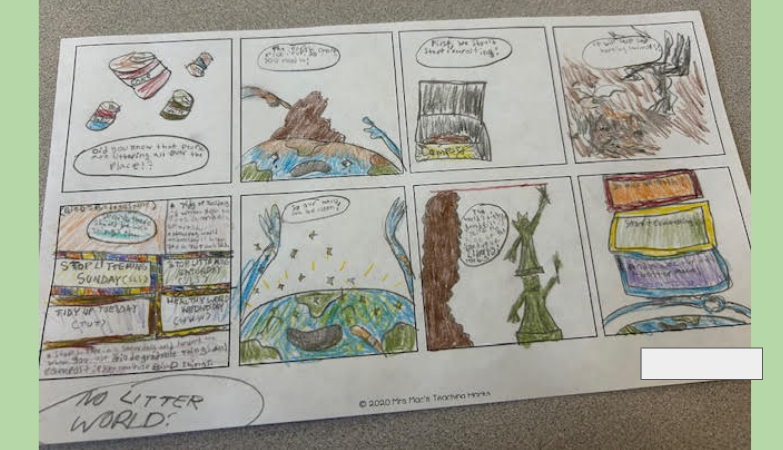 Students created comic strips that encourages our community to go and pick up litter and also to reuse thing so that less litter happens.