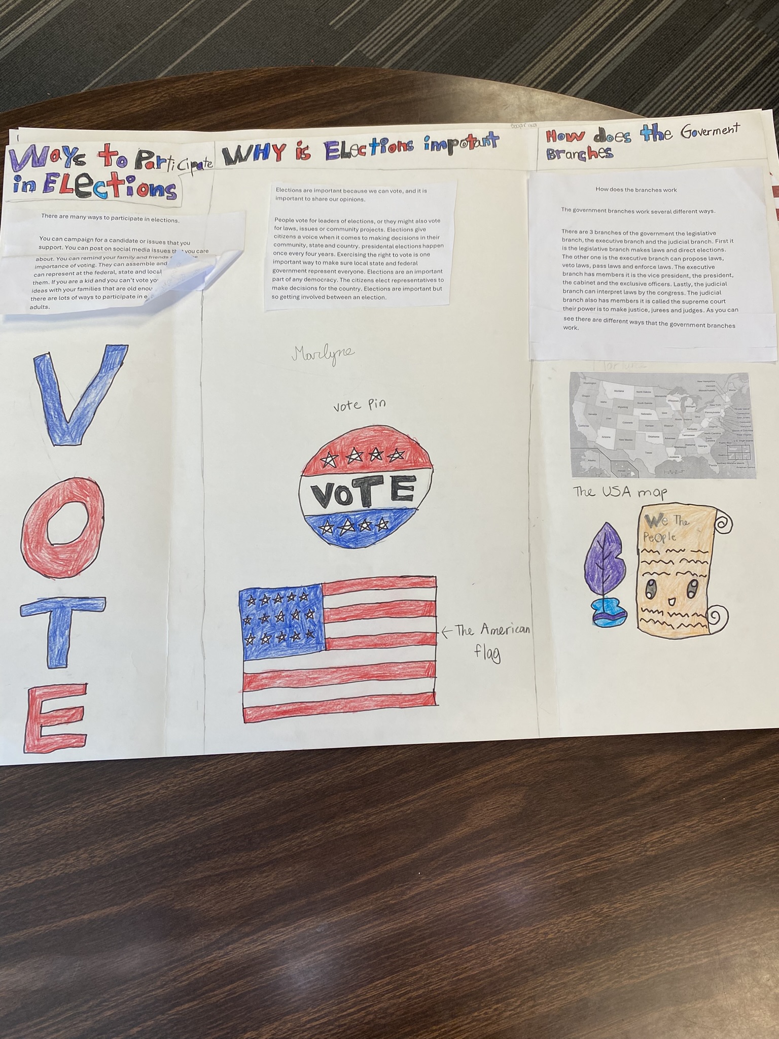 Students created a museum display on the importance of elections based on the Rights and Responsibilities unit in fifth grade. We considered information like the structure of government and how they solve problems, as well as a citizen's right to vote and what they can do to go above and beyond that right.