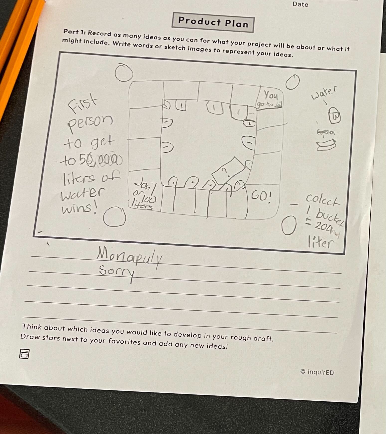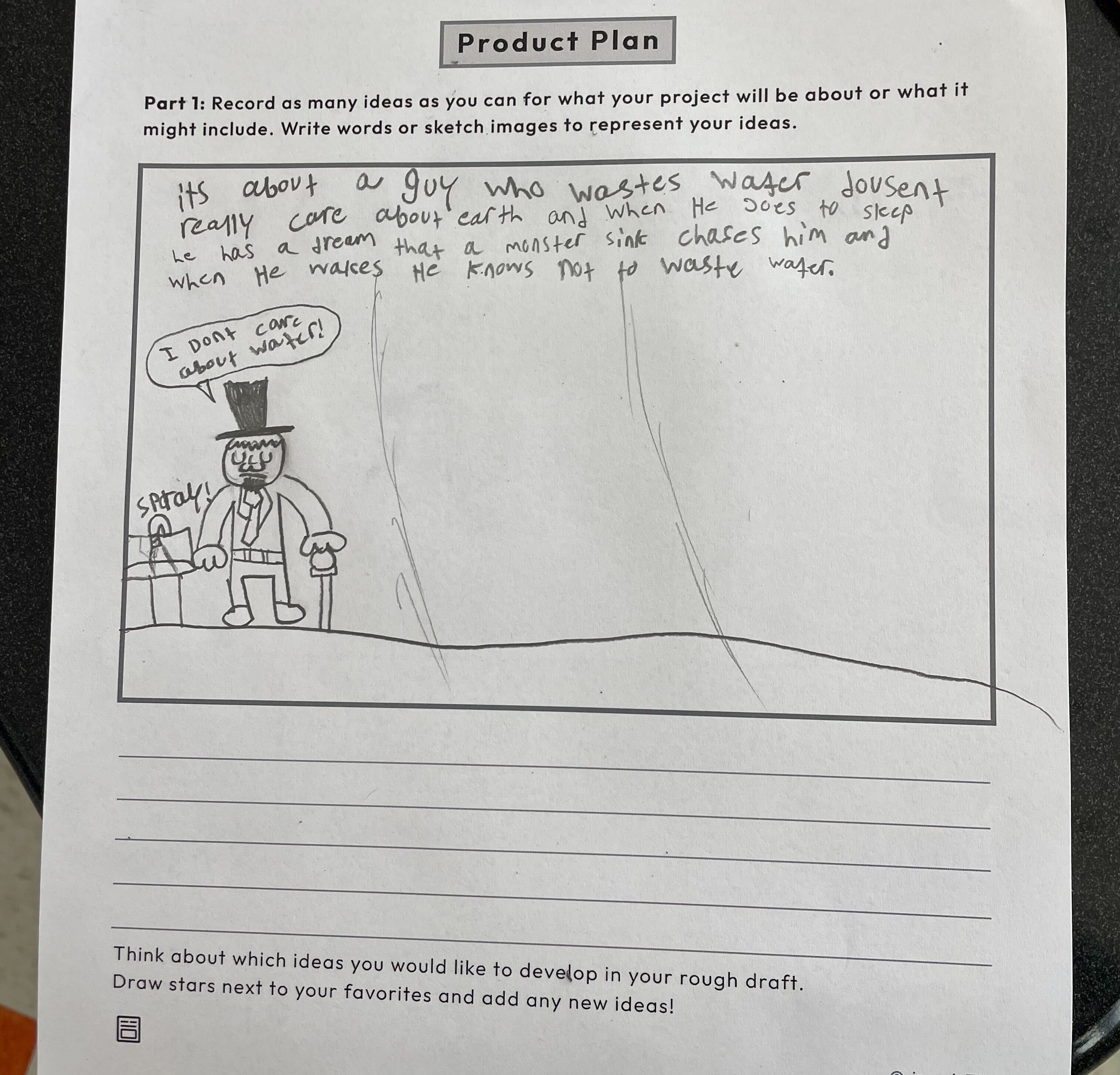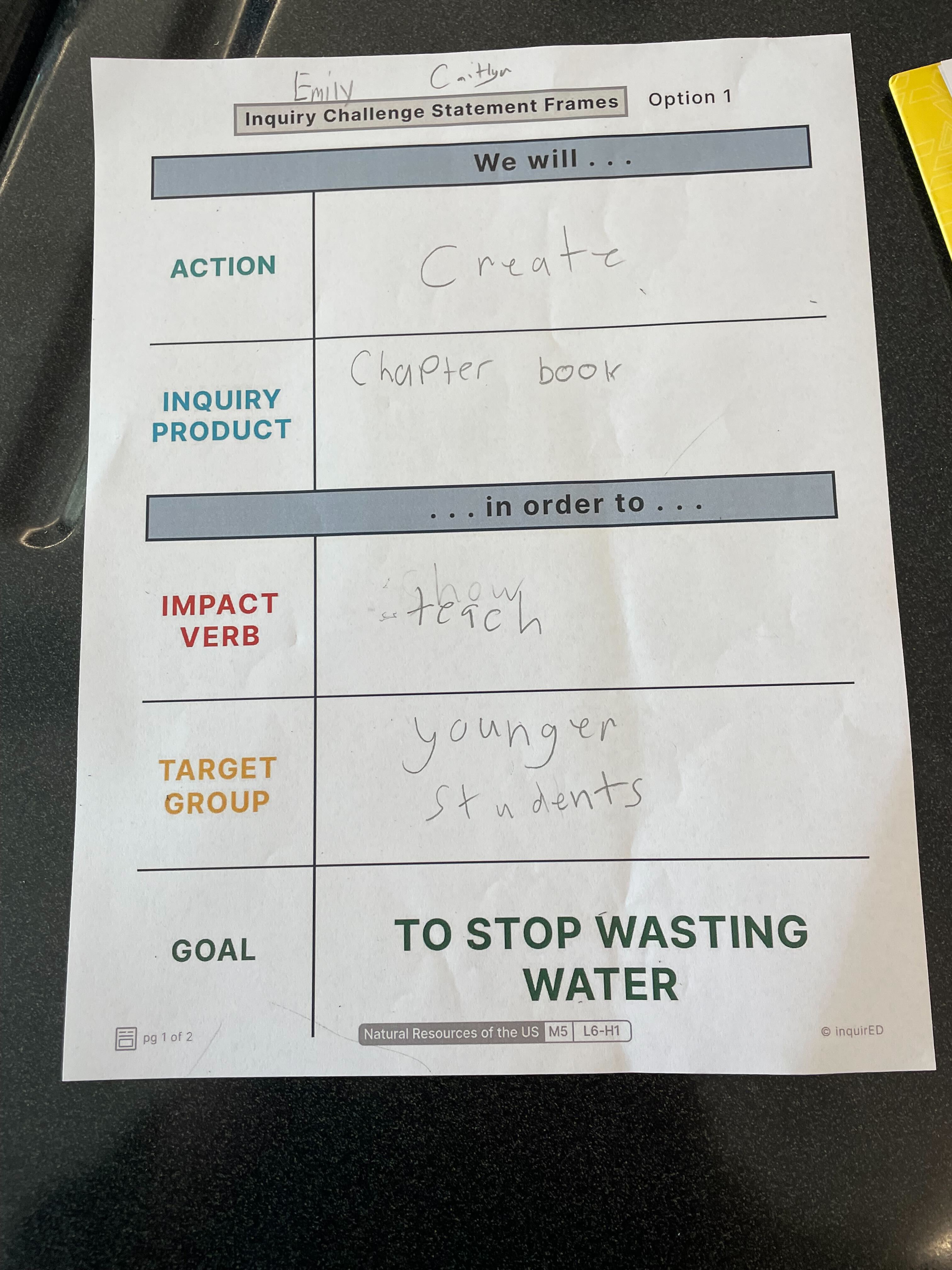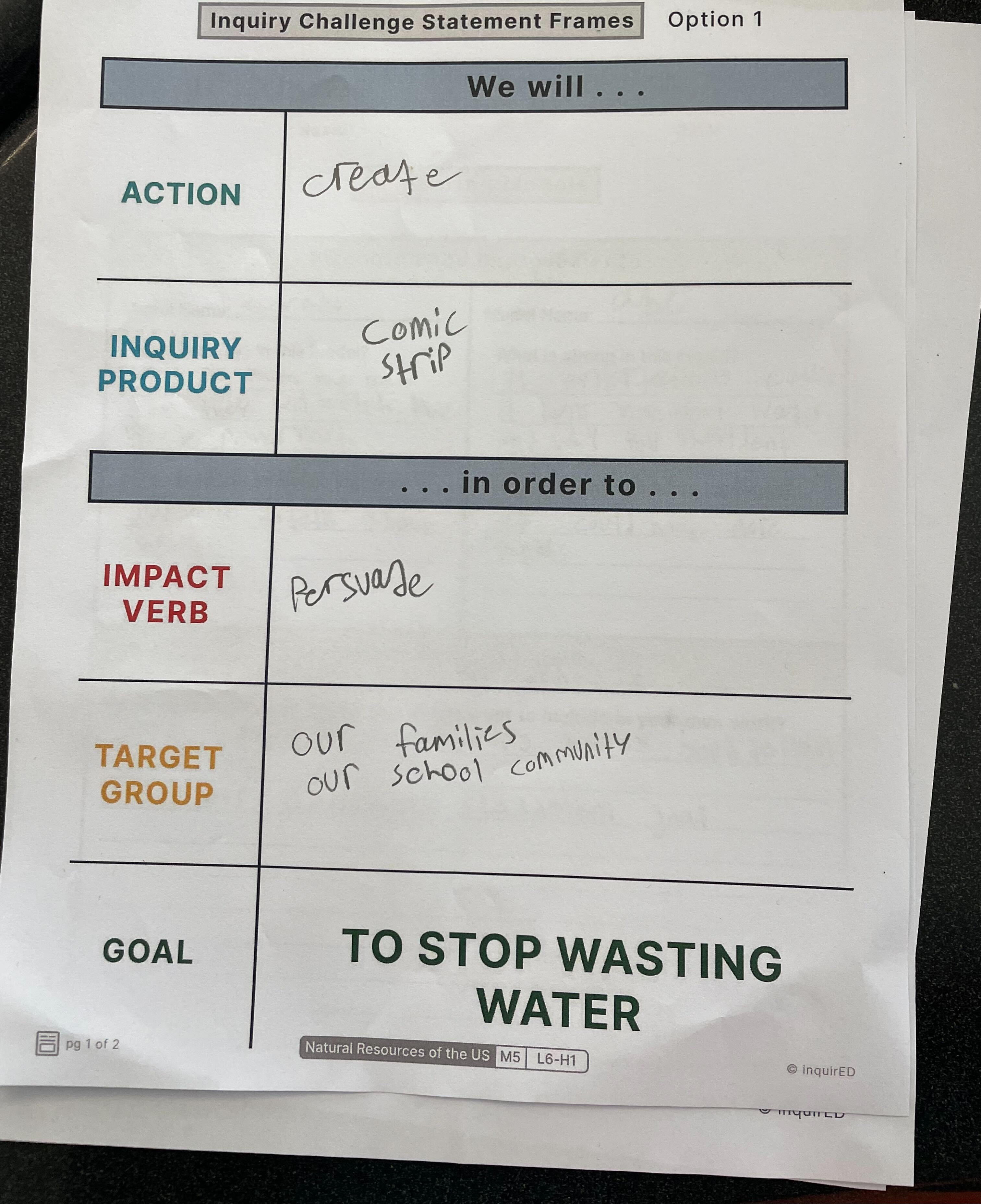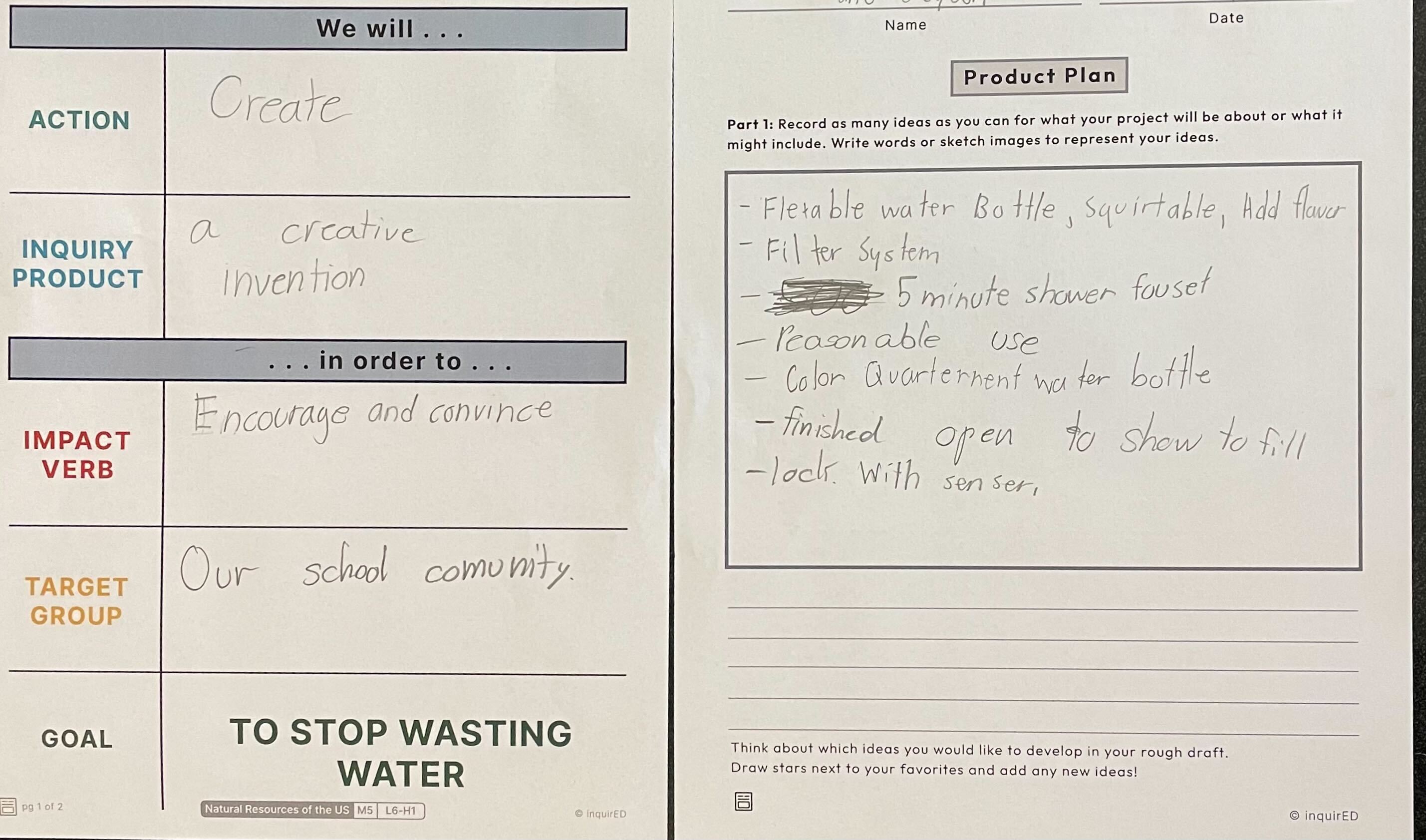 The students collaboratively determine what the goal would be for their final products in the Natural Resources Inquiry in response to the Inquiry question, "How should we use the natural resources of the United States?" The common class goal was to stop wasting water, and students decided whether they would work independently or in groups for how they would take action to accomplish this goal. Pictured are some of students' Inquiry Challenge Statements, and Product Plans from Module 6 brainstorming lesson "Brainstorm: Generating Ideas for the Work."